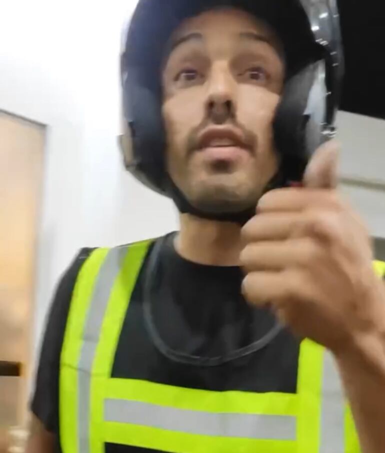 El joven que graba el video muestra a otro joven vestido de negro, con walkie talkie en mano y chaleco reflectivo sin logo del municipio.