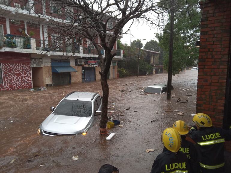 En una de las inundaciones de esta tarde, una persona quedó atrapada dentro de su vehículo y los bomberos de Luque lograron rescatarla, sin que requiera algún tipo de asistencia médica, según confirmó a ABC Color una de las voluntarias intervinientes, Jessica Espínola.