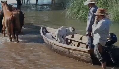 Los terneros son trasladados en pequeñas embarcaciones desde los establecimientos ganaderos ubicados en el distrito de Cerrito, departamento de Ñeembucú, donde las aguas del río subieron considerablemente luego de las últimas lluvias, apeligrando el bienestar de los animales.