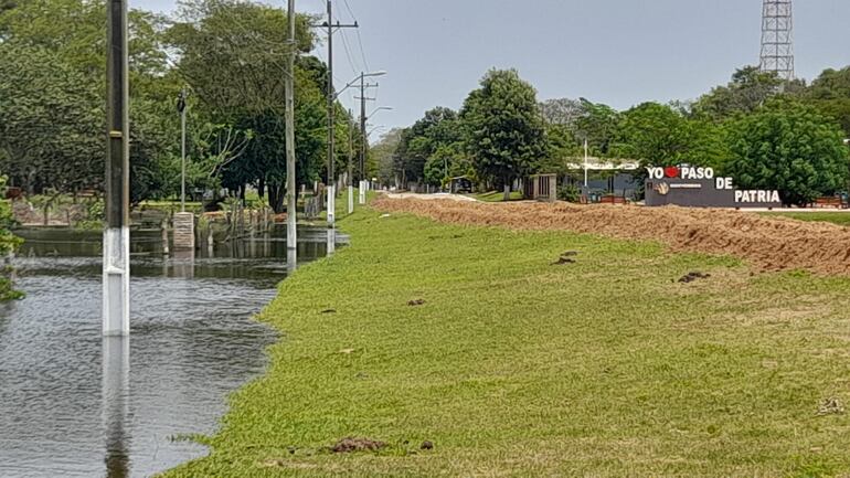 “Para evitar que el agua corte el camino en esta parte baja estamos construyendo el muro de contención con tierras, así evitaremos que la población de Paso de Patria se quede aislada”, comentó.