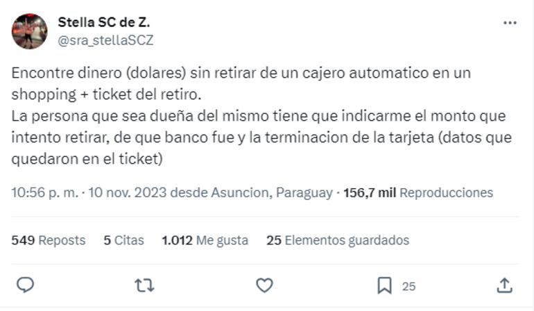 Hace un par de días que Stella Servín busca a una persona que sería propietaria de unos dólares que ella había encontrado recientemente en el cajero automático de un shopping, junto a la boleta del extracto. La mujer dio a conocer el caso en sus redes sociales con la intención de devolver el dinero.
