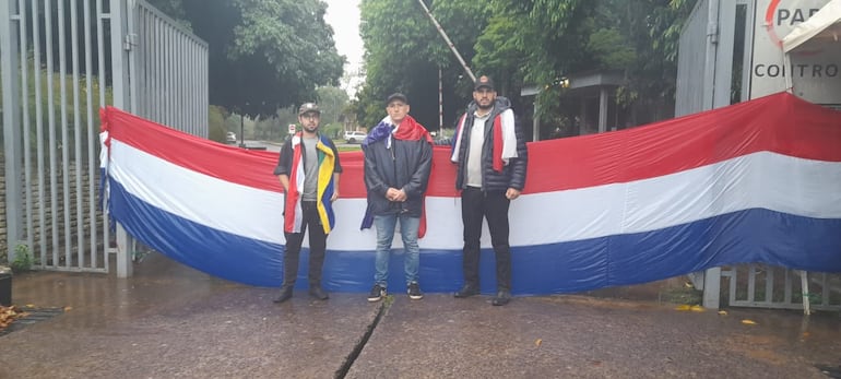 Lucas Fernández, Luis Vega y Ever Roldán se manifiestan frente a los portones de la Entidad Binacional Yacyretá (EBY), sede Ayolas, para solicitar al director paraguayo, Luis Benítez, una audiencia para poder hablar acerca de la situación que se generó con la cancelación del concurso que tenía como meta cubrir cargos de técnicos en la Central Hidroeléctrica Yacyretá.