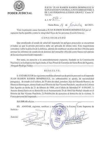 La familia se volvió a comunicar con el supuesto actuario, reciben el argumento de que fue un error de “tipeo”, vuelven a enviar la resolución, con sello del Poder Judicial y firma de un juez y de actuario quienes ya no trabajan en Santa Rosa del Aguaray. Volvieron a consultar en la Comisaria si era lo correcto, pero ante el caso los uniformados denunciaron el hecho.