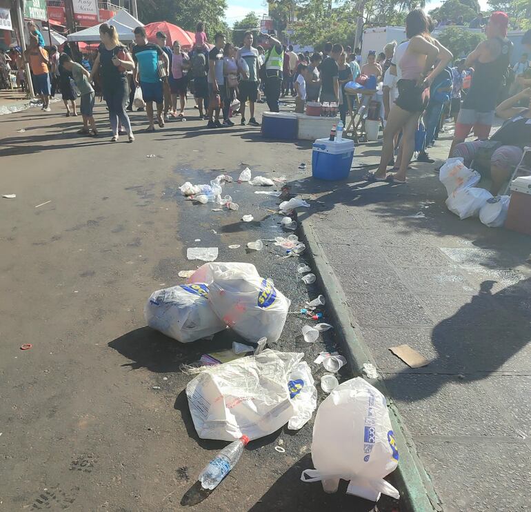 Todo tipo de desechos se observan en la vereda de la Basílica, por donde transitan miles de peregrinos para llegar a la Villa Serrana.