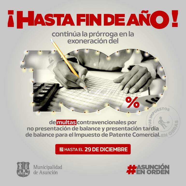 Hasta el 29 de diciembre continúa la prórroga de exoneración de multas contravencionales por falta del balance para impuesto de patente comercial, según comunicó la Municipalidad de Asunción.
