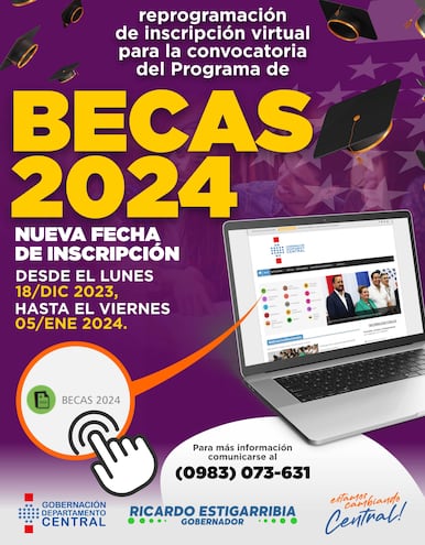 La Gobernación del departamento Central ofrece oportunidad para más de 500 jóvenes de escasos recursos económicos de acceder a becas universitarias. El proceso de registro electrónico estará disponible desde hoy hasta el 5 de enero. Los interesados podrán registrar electrónicamente los documentos requeridos a través del formulario disponible en la página web institucional www.central.gov.py. El proceso de selección consta de la documentación completa presentada, examen de conocimiento y entrevista.