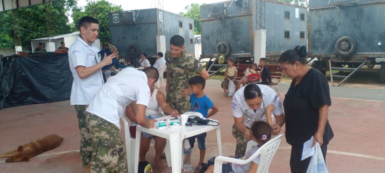 La atención médica se realiza con entrega de medicamentos a personas de distintas edades que se acercan a los puestos de consultorios habilitados en el polideportivo comunitario. Además del control médico que realizan los galenos, un grupo de efectivos militares realizaron servicio de peluquería gratuito a los niños de la comunidad.