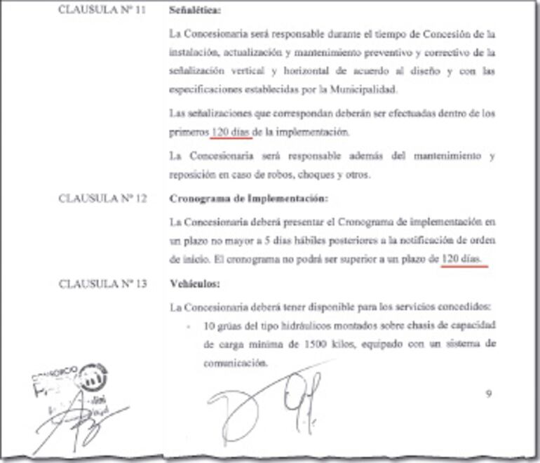Según el contrato del estacionamiento tarifado y su adenda, en la cláusula número 12 sobre el cronograma de implementación, se dicta que la concesionaria (Parxin) deberá presentar el cronograma de implementación en un plazo no mayor a cinco días hábiles posteriores a la notificación de orden de inicio. Luego señala que “el cronograma no podrá ser superior a 120 días”.