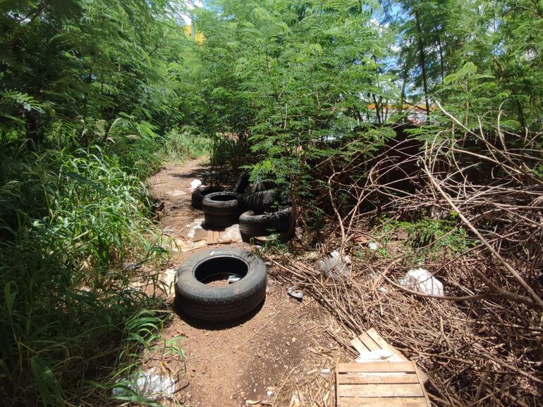En la ciudad de Encarnación, a pocos metros de la rotonda San Roque González de Santa Cruz, en el acceso al puente internacional del mismo nombre, un enorme patio baldío cubierto de malezas es utilizado como vertedero de cubiertas viejas.