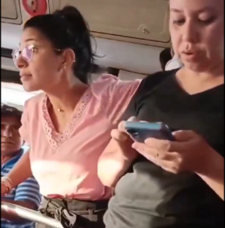 Se escuchan voces de otros pasajeros que pedían seguir con el trayecto, pero el chofer insistía en que se pasara más hacia atrás y la joven le preguntó si quería que subieran sobre su cabeza porque ya no había lugar.