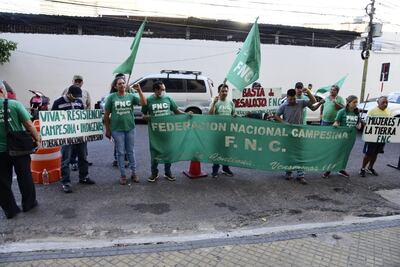Labriegos que componen la Federación Nacional Campesina se congregaron este martes frente a la sede del Ministerio de Agricultura, para exigir al titular del ente, Carlos Giménez, que aclare sus recientes dichos.