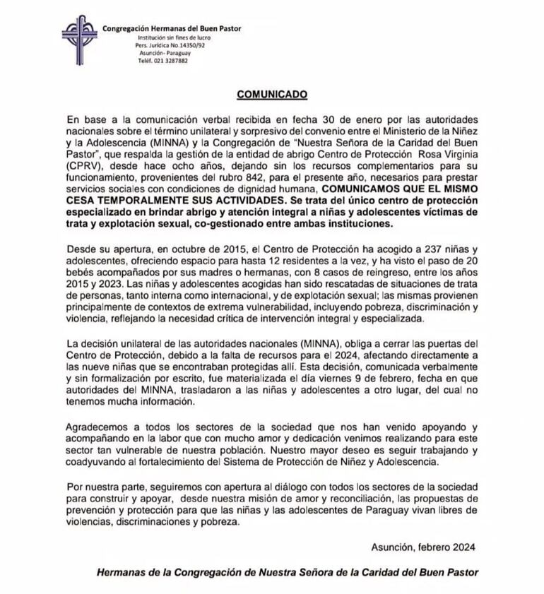 El Centro de Protección Rosa Virginia, perteneciente a la congregación “Hermanas del Buen Pastor”, cerró temporalmente sus actividades tras una comunicación verbal por parte del Ministerio de la Niñez y la Adolescencia (MINNA) del término unilateral y sorpresivo de un convenio entre ambos.