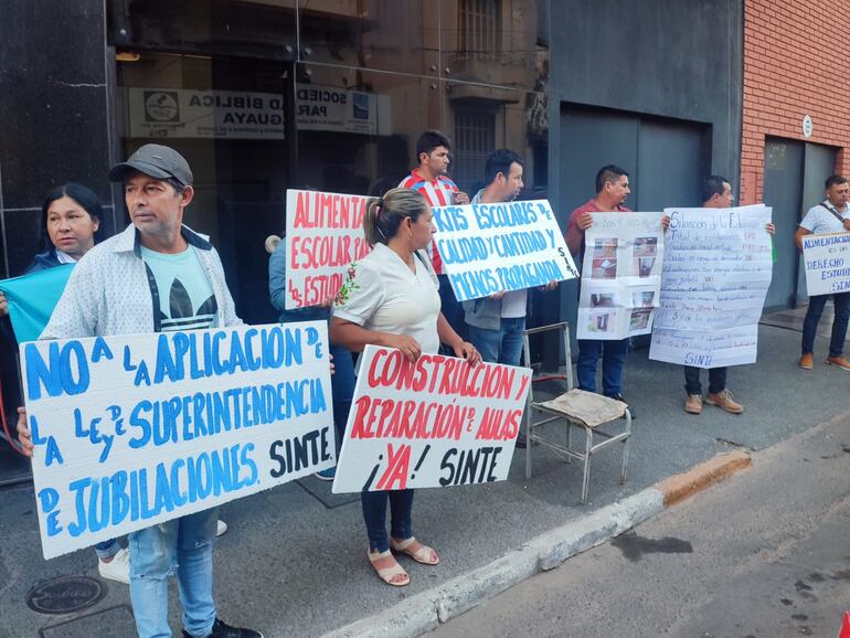 Docentes agremiados en el Sindicato Nacional de Trabajadores de la Educación se manifiestan este miércoles frente a la sede del Ministerio de Educación y Ciencias, en el centro de Asunción, con reclamos que incluyen la falta de asistencia con problemas de infraestructura, la mala calidad de kits escolares y la insuficiencia de rubros para docentes, entre otras preocupaciones.