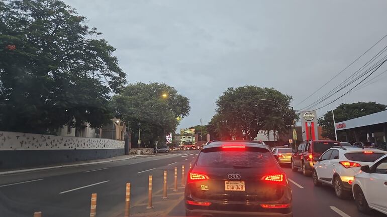 Largas filas de automóviles se registran sobre la avenida Mariscal López, frente a la cárcel del Buen Pastor y el cementerio de la Recoleta, debido a que el semáforo que está instalado en Choferes del Chaco no está en funcionamiento, en plena hora pico.