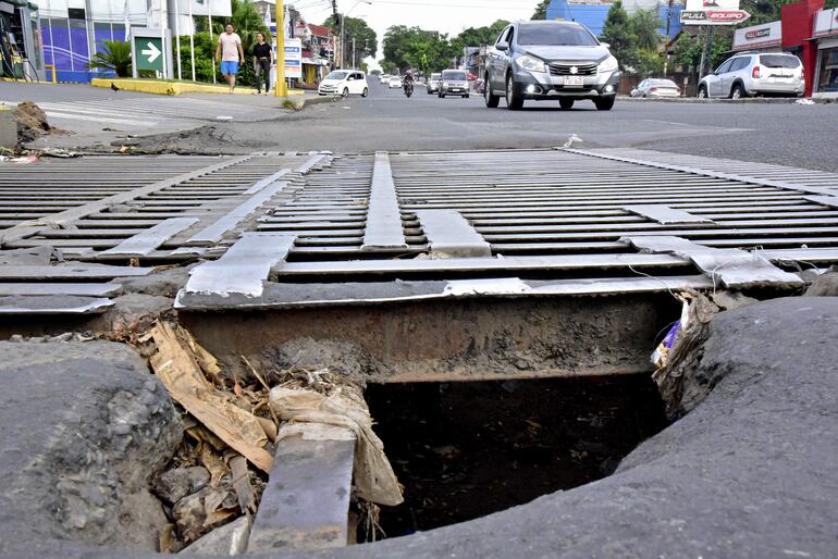 Se suman baches y falta de señalización en todo el recorrido hasta llegar al Mercado 4 y caños rotos en las esquinas de Pariri, Teniente Ramellia y Médicos del Chaco.