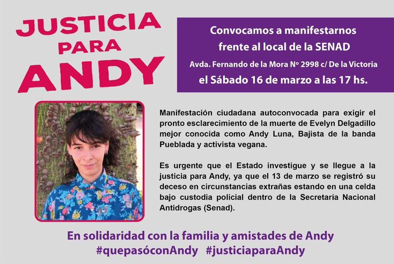 Pese a que el resultado de la autopsia habla de una posible autoeliminación, los familiares de Evelyn “Andy Luna” Delgadillo siguen pidiendo que se esclarezca el caso. A las 17:00 van a reunirse frente a la sede Central de la Senad, en la avenida Fernando de la Mora casi De la Victoria, para pedir el “castigo de los responsables”.