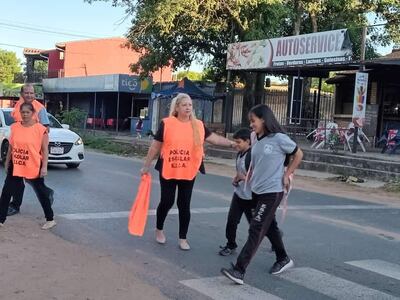 La directora de la escuela Cándida Achucarro, ubicada en el barrio homónimo de la ciudad de San Antonio, profesora Norma Romero, y algunos docentes se convirtieron en “policías de tránsito” para ayudar a los alumnos a cruzar la avenida.