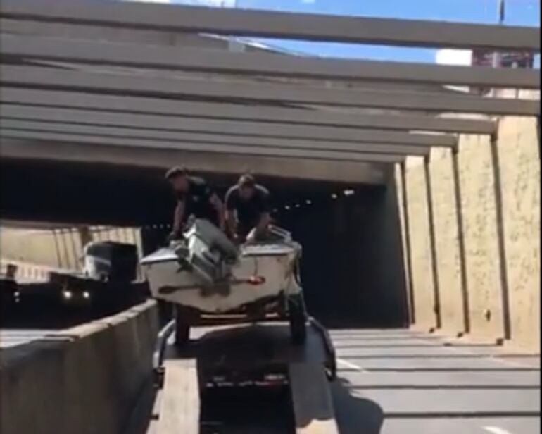 En el video que se viralizó en redes sociales, se escucha cómo una mujer increpa a las personas que están llevando la lancha, tratando de sacarla de la calle, mencionando que serían militares.