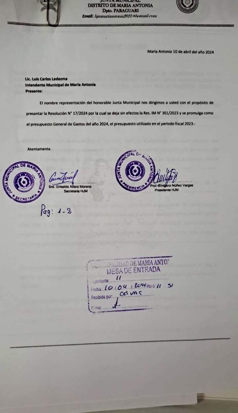 El cruce de denuncias entre el intendente de María Antonia, José Carlos Ledezma (colorado cartista) y un sector de la Junta Municipal obedece a que el ejecutivo municipal remitió al cuerpo legislativo un proyecto de presupuesto para el ejercicio fiscal 2024, que fue rechazado. El jefe comunal vetó la resolución de la Junta, los ediles se ratificaron en su postura, pero finalmente Ledezma sancionó la ordenanza.