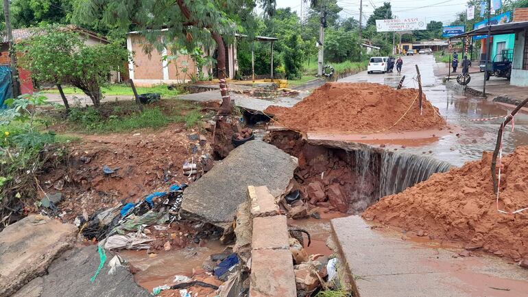Un enorme pozo se formó en la cabecera de la pasarela de la referida vía, y consecuentemente, algunos vecinos no pueden ingresar a sus casas, y exigen una rápida solución a las autoridades, tanto de San Antonio como de Ñemby.