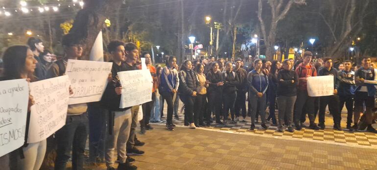 Alumnos del tercer año de la carrera de Ciencias de la Comunicación para el Desarrollo de la Facultad de Ciencias, Tecnologías y Artes, de la Universidad Nacional de Pilar (UNP) llevaron a cabo una manifestación en la Plaza de los Héroes de la ciudad de Pilar para exigir la derogación de la Ley Hambre Cero.