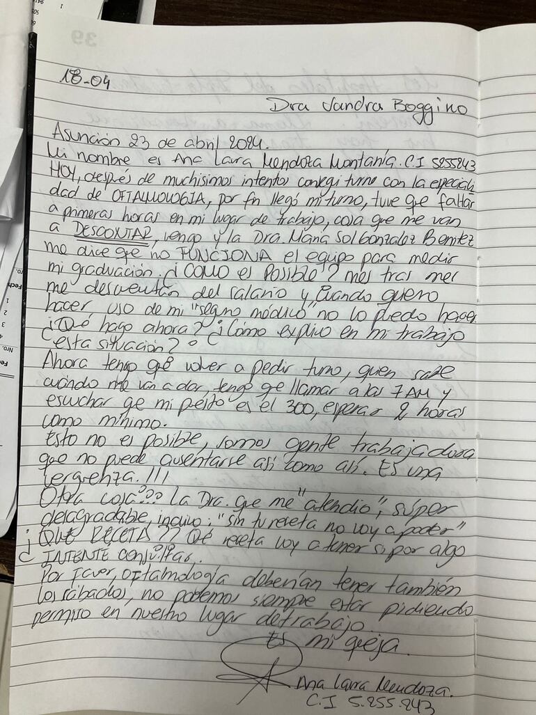 Ana Laura fue al área administrativa para quejarse, pero le dijeron que la directora estaba ocupada. Como no podía esperar más, pues debe cumplir un horario en su trabajo, decidió dejar una especie de carta en el libro de quejas que le entregó un funcionario.