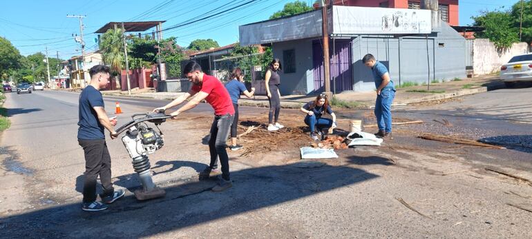 Este domingo se llevaron a cabo obras para arreglar la zona límite entre San Lorenzo y Fernando de la Mora, sobre las calles Leopardi y Lomas Valentinas específicamente, aunque los trabajos no fueron realizados por funcionarios de ninguna de las municipalidades, sino por jóvenes que juntan recursos y hacen el trabajo que correspondería a las comunas.