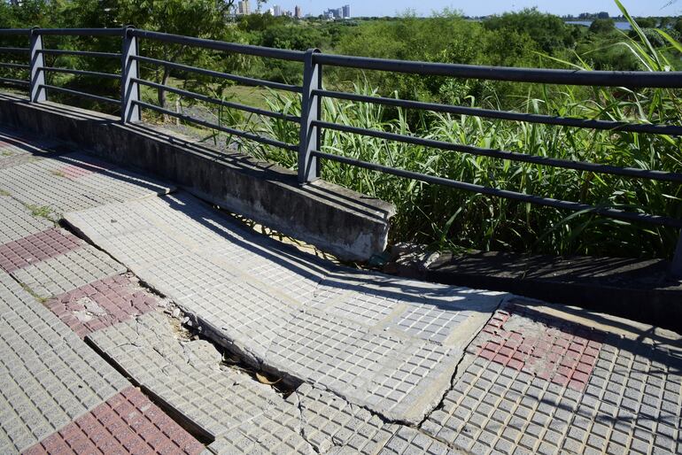 En el sitio se ve que parte del cantero de la baranda ya no está y las veredas se encuentran rotas, además de que el piso presenta sinuosidades. El problema está hace semanas, pero la gente sigue caminando por el lugar, de manera peligrosa.