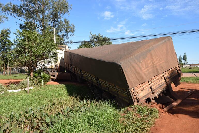 La zona crítica se encuentra en la esquina formada entre las calles Sebastián Gaboto y Yegros frente a la plaza del barrio San José de San Juan Nepomuceno, a una cuadra de la calle Paí Fariña que conecta con la ruta PY18. Ayer, aproximadamente a las 15:00, la carreta de un camión sojero cayó en un canal de drenaje y