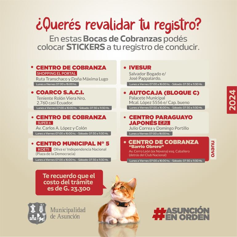Por otra parte, la renovación total de la licencia de conducir tiene otro costo y sus requisitos están detallados en un flyer disponible en la página web de la Municipalidad de Asunción, aunque esta información disponible en la plataforma oficial de la comuna aparentemente no está actualizada.