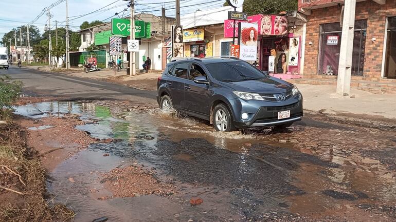 Otra zona afectada por los baches es el tramo de la calle Alelí y Cristo Rey, en donde se presenta la misma situación, pero con sentido hacia la Avda. del Agrónomo. En este trayecto los automovilistas deben pasar con mucha cautela debido a un enorme bache provocado por la pérdida del servicio sanitario de la Empresa de Servicios Sanitario del Paraguay (Essap).