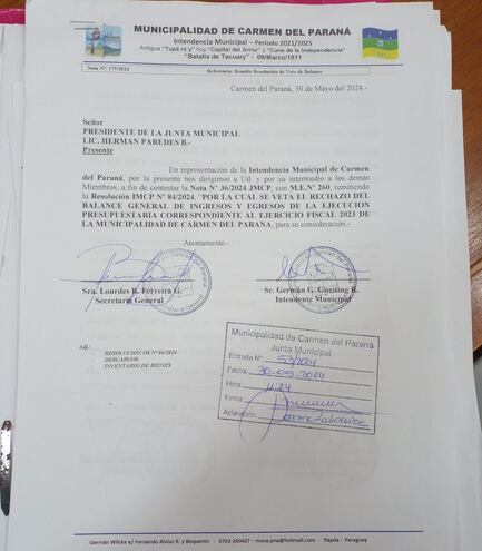 El 30 de mayo pasado el intendente Gneiting había remitido a la Junta su Resolución número 84/2024 “Por el cual se veta el rechazo del balance general de ingresos y egresos de la ejecución presupuestaria correspondiente al ejercicio fiscal 2023 de la Municipalidad de Carmen del Paraná”. El documento va acompañado de un listado de siete puntos bajo el acápite “Descargo a las observaciones”.