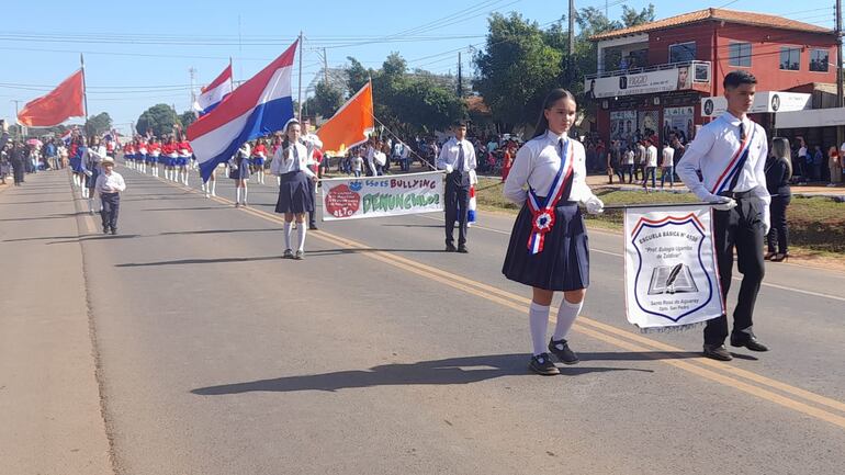 Esta mañana comenzó la jornada de festejos con el desfile cívico estudiantil, sobre la ruta PY11. Cada institución y población estudiantil lució sus mejores galas y rindieron homenaje a la ciudad y a los que lucharon hasta logar que Santa Rosa del Aguaray sea distrito sampedrano, hace 22 años. En horas de la tarde, sigue la jornada con jineteada y este sábado se cierran los festejos con la quinta edición del Festival del Agua Pura, con renombrados artistas.