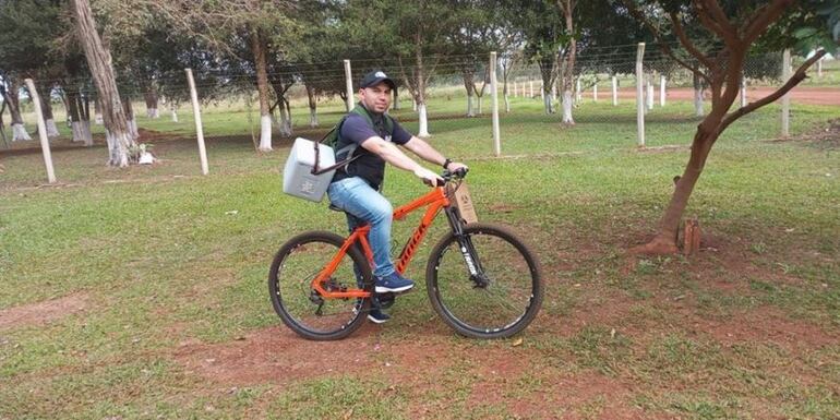 Lo llamativo es que el profesional lo hace con su bicicleta y mediante pedaleos llega a las viviendas para acercar las dosis disponibles para personas de todas las edades.