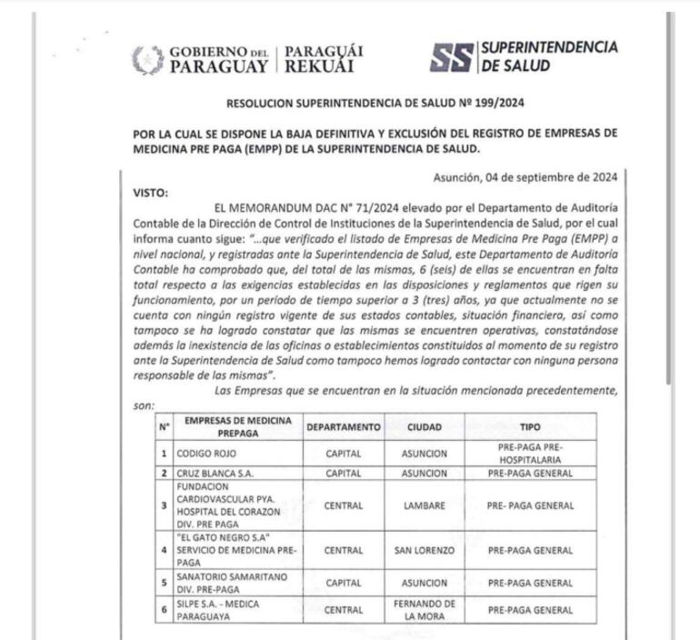 La prepaga hospitalaria Código Rojo y las prepagas generales Cruz Blanca, Fundación Cardiovascular Paraguay, El Gato Negro S.A, Sanatorio Samaritano (división prepaga) y Silpe S.A. fueron clausuradas por la Superintendencia de Salud según Resolución N° 199/2024. Estas empresas prestadoras de servicios médicos fueron dadas de baja a partir de hoy y, además se dispuso la exclusión de los registros de Entidades Prestadoras de Servicios de Salud.