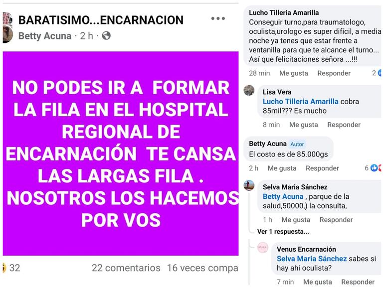 La mujer que ofertaba el supuesto servicio habló con la prensa para explicar lo que en realidad estaba ofreciendo. Según su relato, ella solamente iba hasta el hospital a formar la fila en lugar de la persona que le pagaba. Explicó que es nada más una usuaria de los servicios.
