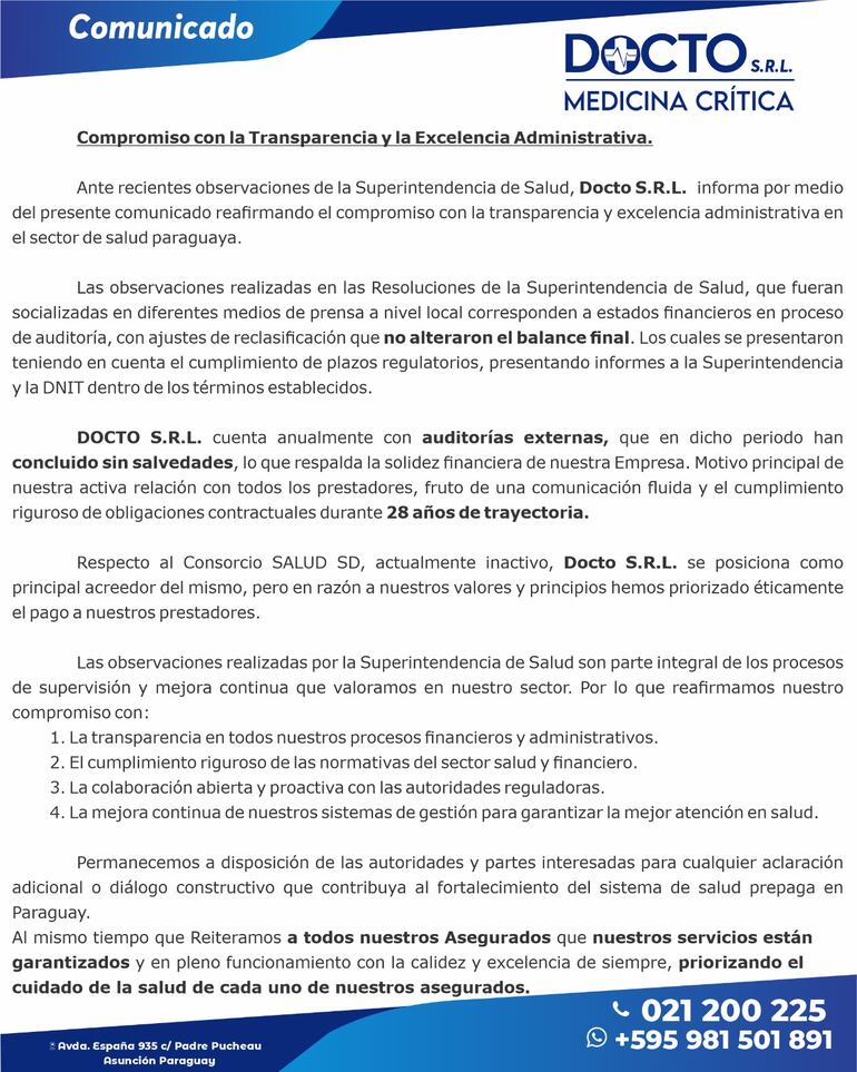 En un comunicado remitido a ABC por Docto SRL, empresa de medicina prepaga del Sanatorio Americano, la empresa asegura que tienen un firme compromiso con la transparencia y excelencia administrativa en el sector de salud paraguaya. La prestadora de servicios fue amonestada la semana pasada por la Superintendencia de Salud y tiene la prohibición de adherir nuevos asegurados.