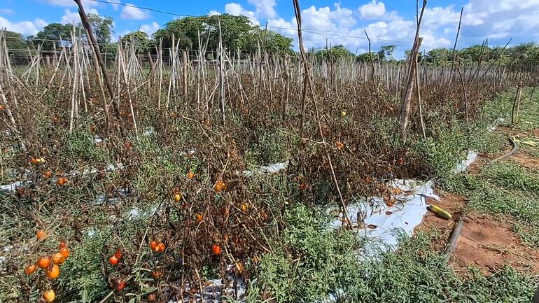 La triste imagen de los tomates podridos en las plantas y otros tirados en el suelo, se ve en la propiedad de Maximino Melgarejo. Este productor dijo que son unos 10 mil kilos de la fruta los que se han perdido por no poder comercializarlos, el perjuicio económico es enorme.