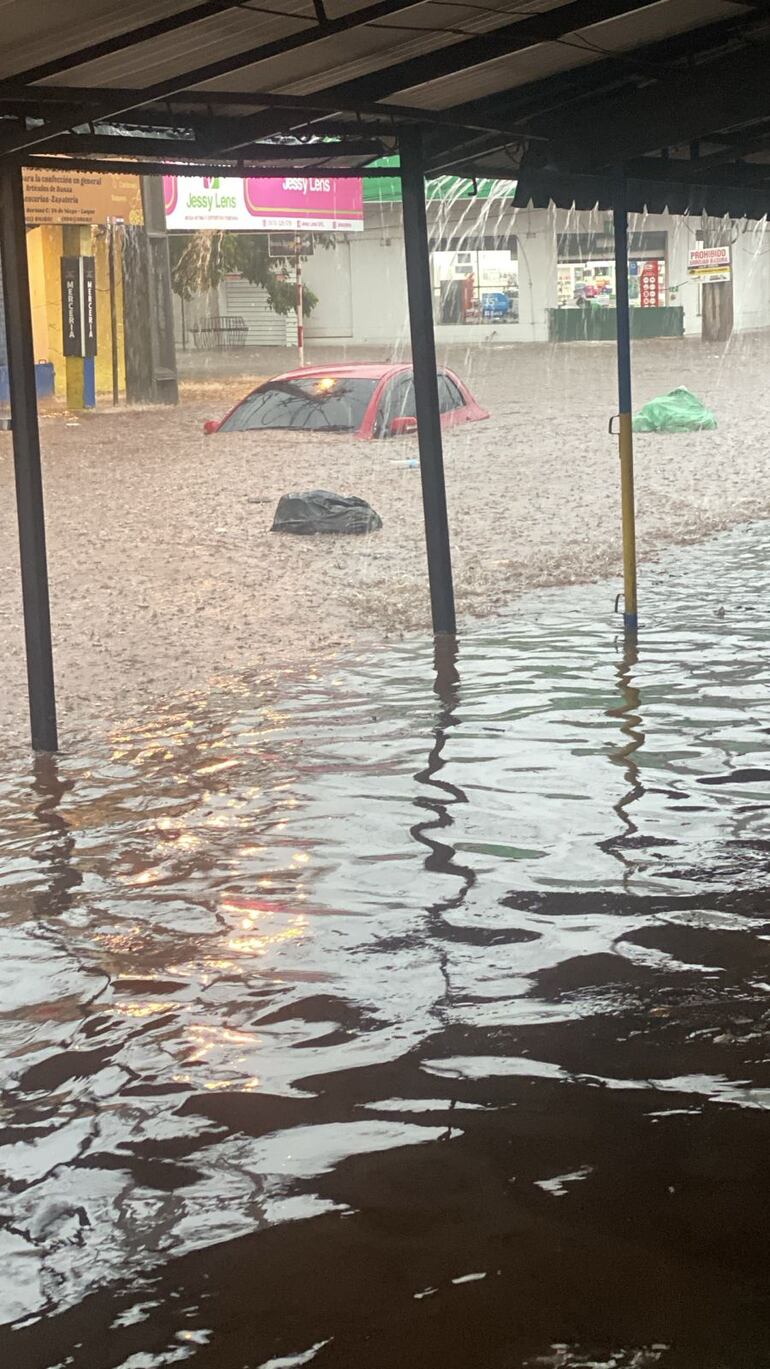 Una tremenda inundación cubrió las calles y veredas del mercado municipal de la ciudad de Luque en pocos minutos de lluvia, a tal punto que un auto fue literalmente tragado.