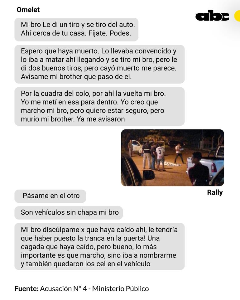 En la acusación contra Tío Rico se describe lo dicho por Sebastián Marset, “el 24 de octubre de 2020 le comentó que “le mató con «dos buenos tiros», cerca de la casa de Miguel Insfrán, pero que la víctima del homicidio se tiró del auto, por lo que le pidió al acusado que se fije, porque quiere estar seguro de que esté muerto”.