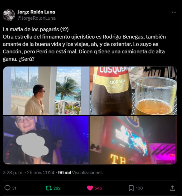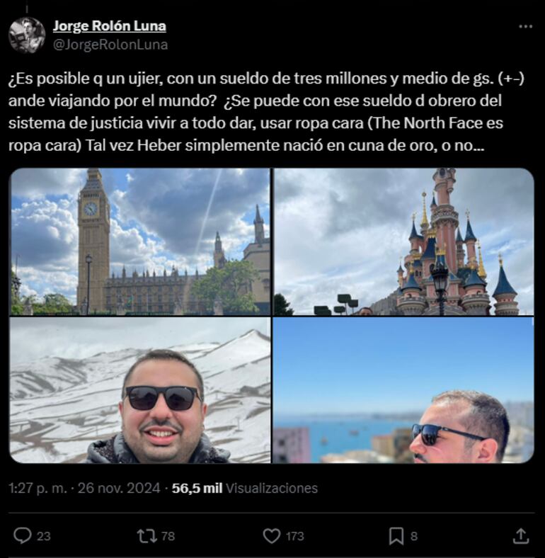 Jorge Rolón Luna también hizo comparaciones entre los salarios de los ujieres denunciados y el ostentoso estilo de vida de los mismos, además de las posibles conexiones políticas que tendrían, posteando fotos de uno de los denunciados con el declarado significativamente corrupto por Estados Unidos, Jorge Bogarin.