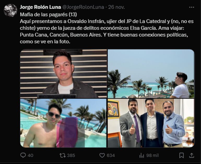 “Aquí presentamos a Osvaldo Insfrán, ujier del JP de La Catedral y (no, no es chiste) yerno de la jueza de delitos económicos, Elsa García. Ama viajar: Punta Cana, Cancún, Buenos Aires. Y tiene buenas conexiones políticas, como se ve en la foto”, indica en uno de sus posteos.
