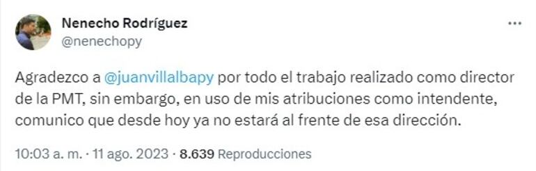 Durante una visita en un programa televisivo, Juan Villalba, quien fue director tanto del Mercado 4 como de la Policía Municipal de Tránsito (PMT) de Asunción, reveló que supuestamente el intendente capitalino, Óscar “Nenecho” Rodríguez lo llamaba “tránkare” -muy pasado de copas- para cerrar locales.