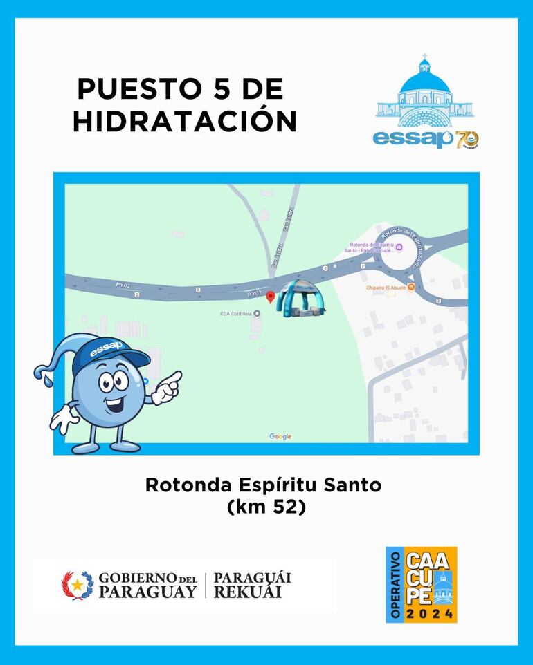 La peregrinación tendrá su punto alto entre el sábado 7 y el domingo 8, y la Essap publicó un listado de los puestos de hidratación que tendrá sobre la Ruta PY02, en el trayecto de peregrinación, donde se proveerá de agua gratuita a los feligreses.