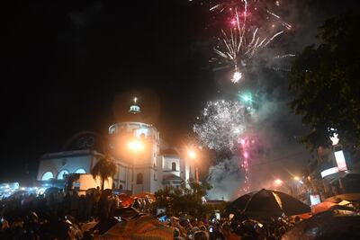 Una gran bandera paraguaya rodeada de varias banderas de la Iglesia Católica durante el canto y danza en la explanada de la Basílica de Caacupé, dieron paso al espectáculo de fuegos artificiales con el que cada año se recibe el Día de la Virgen, al son de la canción “Virgencita de los milagros”.