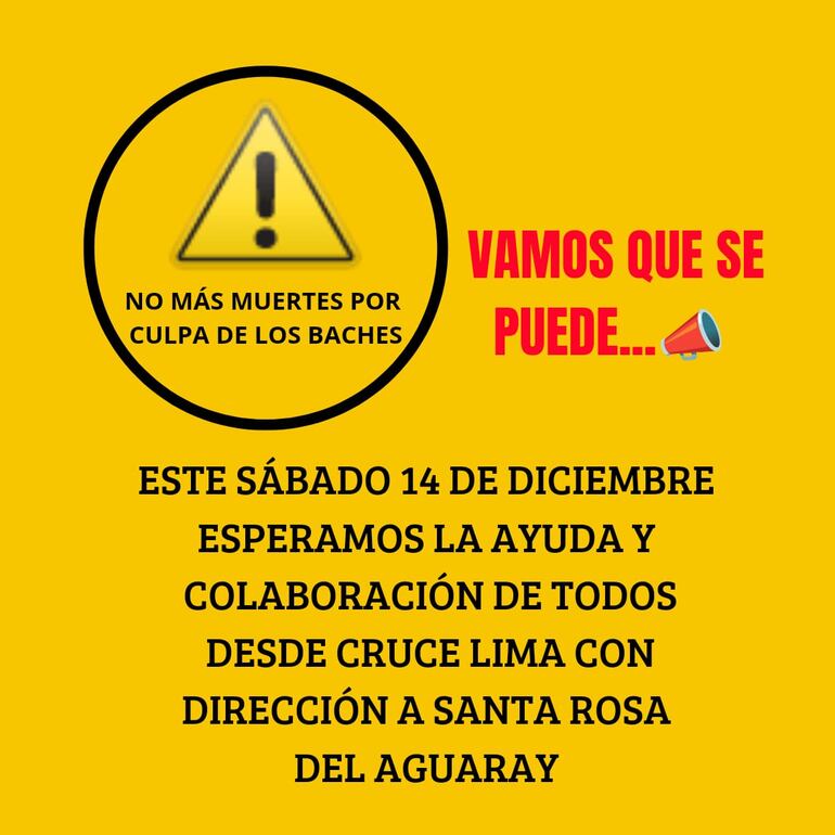 Con el lema “No más muertes por culpa de baches”, los pobladores se autoconvocan para trabajar en la ruta, bajo el mensaje de “unámonos todos para cerrar los baches desde Lima hasta Santa Rosa del Aguaray”. Los trabajos se enfocarán en un tramo de 7 km, y se extiende la invitación a todos los que deseen ayudar para un bien común, incluso, se hace un llamado al Ministerio de Obras Públicas y Comunicaciones para que se una a los esfuerzos de la comunidad.