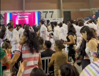 La tarde del jueves, literalmente, “está pasada por agua”. Así lo siente la comunidad educativa del Colegio Nacional de la Capital (CNC) que desarrolló su acto de graduación en el polideportivo de la institución.