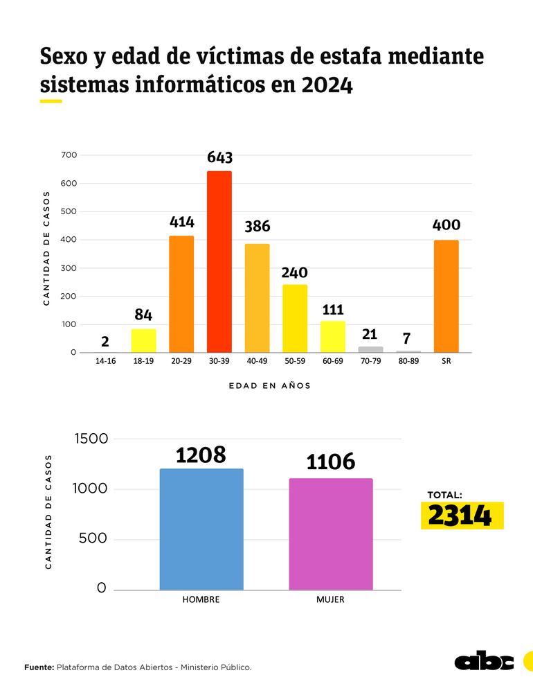 Según las denuncias, 13.665 resultaron víctimas del hecho punible de estafa y otras 2.314 personas fueron blanco de las estafas mediante sistemas informáticos. En ambos tipos penales, las edades de las víctimas se concentran en la franja entre 20 y 40 años, en una mayor proporción, con el 62% de las denuncias recibidas.
