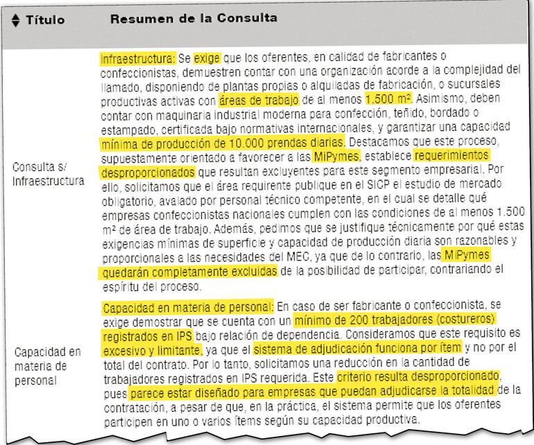 En cuanto a los desproporcionados requerimientos en el Pliego de Bases y Condiciones, los cuestionamientos apuntan a que se piden requisitos que son “casi imposibles” de cumplir por la mayoría de las empresas paraguayas y que excluyen a las mipymes (micro, pequeñas y medianas empresas). Más de 158 dudas fueron planteadas ante Contrataciones Públicas en torno a este llamado.