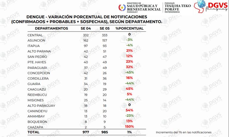 El informe muestra que el otro 51% de notificaciones registradas, corresponden a 13 departamentos: Alto Paraguay, Amambay, Canindeyú, Central, Concepción, Cordillera, Guairá, Itapúa, Misiones, Ñeembucú, Paraguarí, Presidente Hayes y San Pedro.